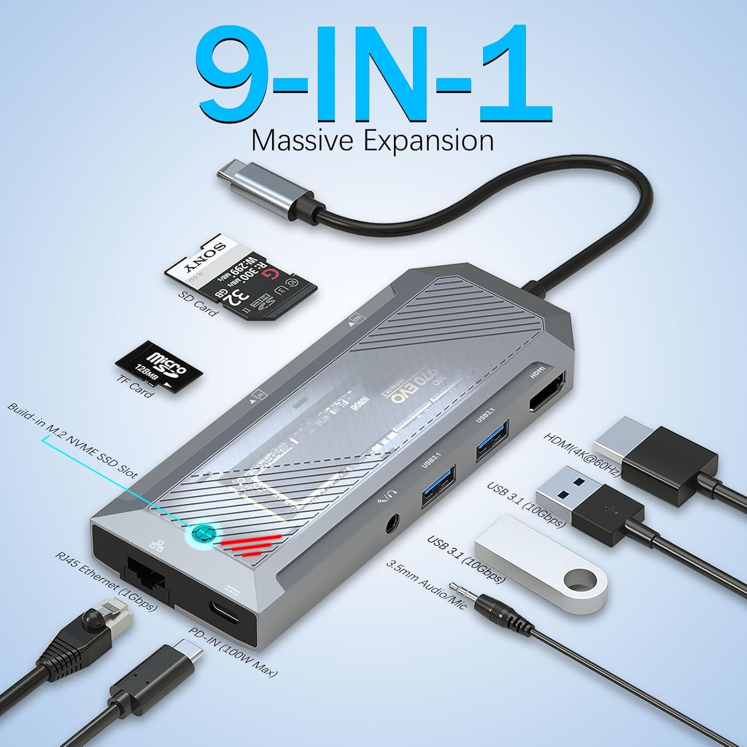 O le 9-in-1 USB-C Hub ma SSD Enclosure mo M.2 NVMe 4K 60Hz HDMI Splitter o se masini faʻalauteleina multifunctional ua mamanuina e faʻaleleia ai le fesoʻotaʻiga o komepiuta feaveaʻi, laupepa, ma isi masini faʻaogaina USB-C. E tu'ufa'atasia galuega taua e iva i totonu o se iunite fa'apipi'i e tasi, e fa'ataga ai tagata fa'aoga e fa'afeso'ota'i le tele o peripherals a'o fa'atumauina le fa'aliliuina o fa'amatalaga maualuga ma le tu'uina atu o le mana fa'alagolago.