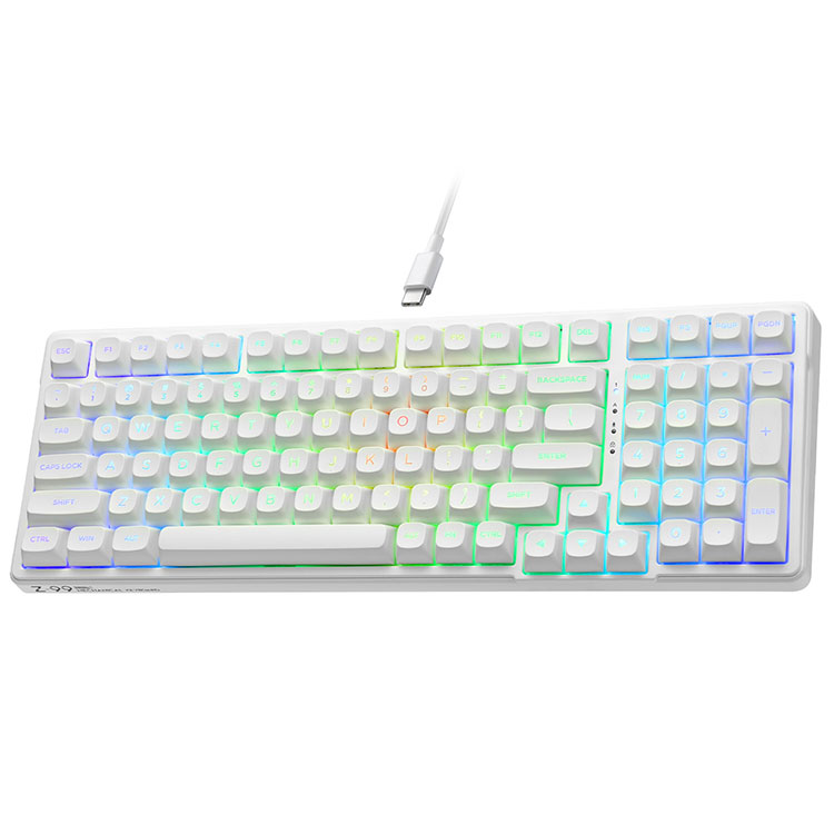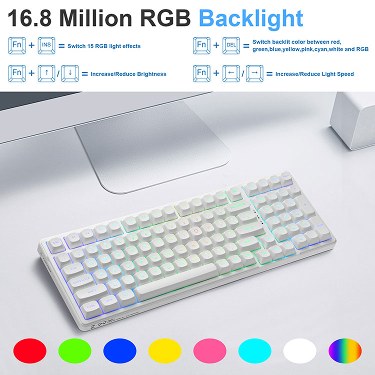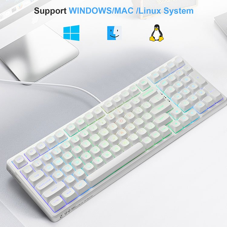 · 【A'afiaga RGB Backlit】O le Z-99 RGB keyboard e aofia ai le 15 faʻamalama faʻamalama ma le 8 feʻaveaʻi lanu lanu. Eseese RGB seti e faʻatamaoaigaina ai lou taimi taina. O le saoasaoa o le moli ma le maualuga e mafai foi ona fetuunai e tusa ai ma lou manaʻoga. Fa'ato'a fana fa'aulu PBT Keycaps, e le mou atu le amio.