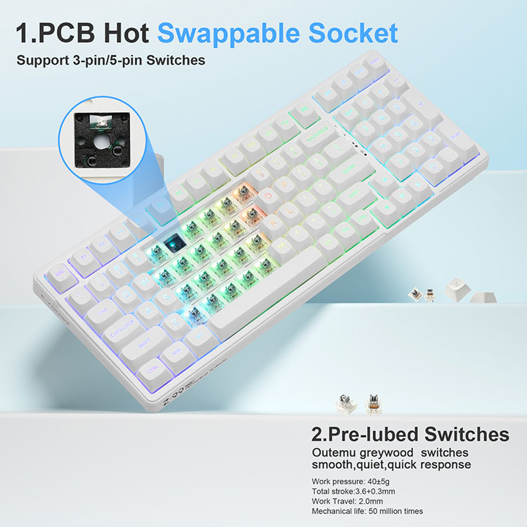 · 【Kesi Fa'asinomaga Fa'apitoa e mafai ona fesuia'i vevela】O ki ma keycaps e mafai ona suia saoloto (keycap/switch puller o loʻo aofia i totonu o le afifi) .O lenei customizable keyboard ma vevela-swap PCB e mafai ai e tagata faʻaoga ona sui 3 pine / 5 pins ki faigofie e aunoa ma solder mataupu. Z-99 piano fa'ainisinia ua fa'apipi'iina i ki'i laina muamua, e maua ai le lagona lelei o le taina ma le manaia o le taina, maua le tali vave mo ta'aloga fiafia.