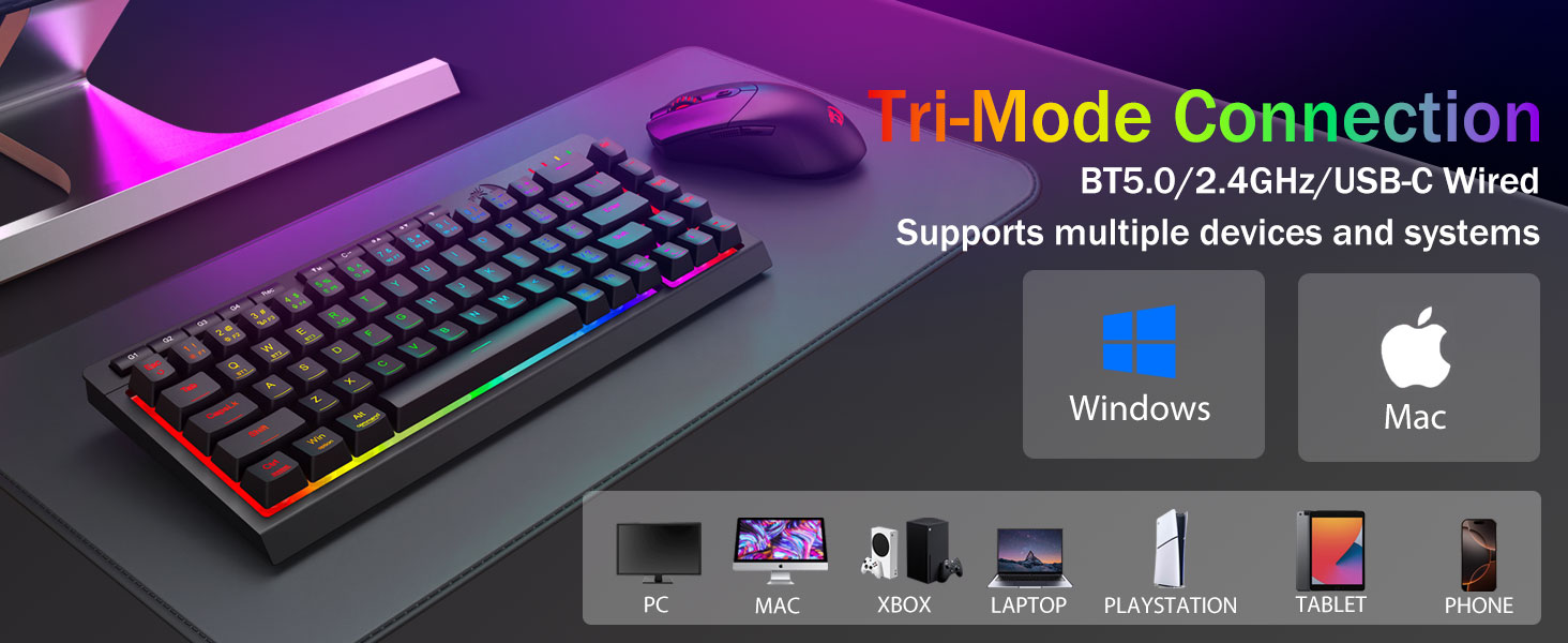 TRI-FOMALI AOAO MA MANATU-MULIMULI MANATU ITULAU -Tali se le mafai ona suia i le va o Bluetooth 5.0, 2.4GHZ o le USB-C, fesoʻotaʻi i le 5 DOCT, PARDS, telefoni, PABY, telefoni, PABY, telefoni, PROBY, telefoni, PROBY, telefoni, PS / CPOBY, telefoni, PABOBY, telefoni, Ph /Box, telefoni, PHBE, telefoni, Ph / CODOB, telefoni. E le mafaitaulia le fiafia i masini e ala i ki poloka po o le itu faamau-atoatoa mo le Hybrid galuega / taaloga seti. Tumau malosi mo vaiaso ma le 4,000mah maa (30+ aso o le itu, 50hrs rgb ringme).