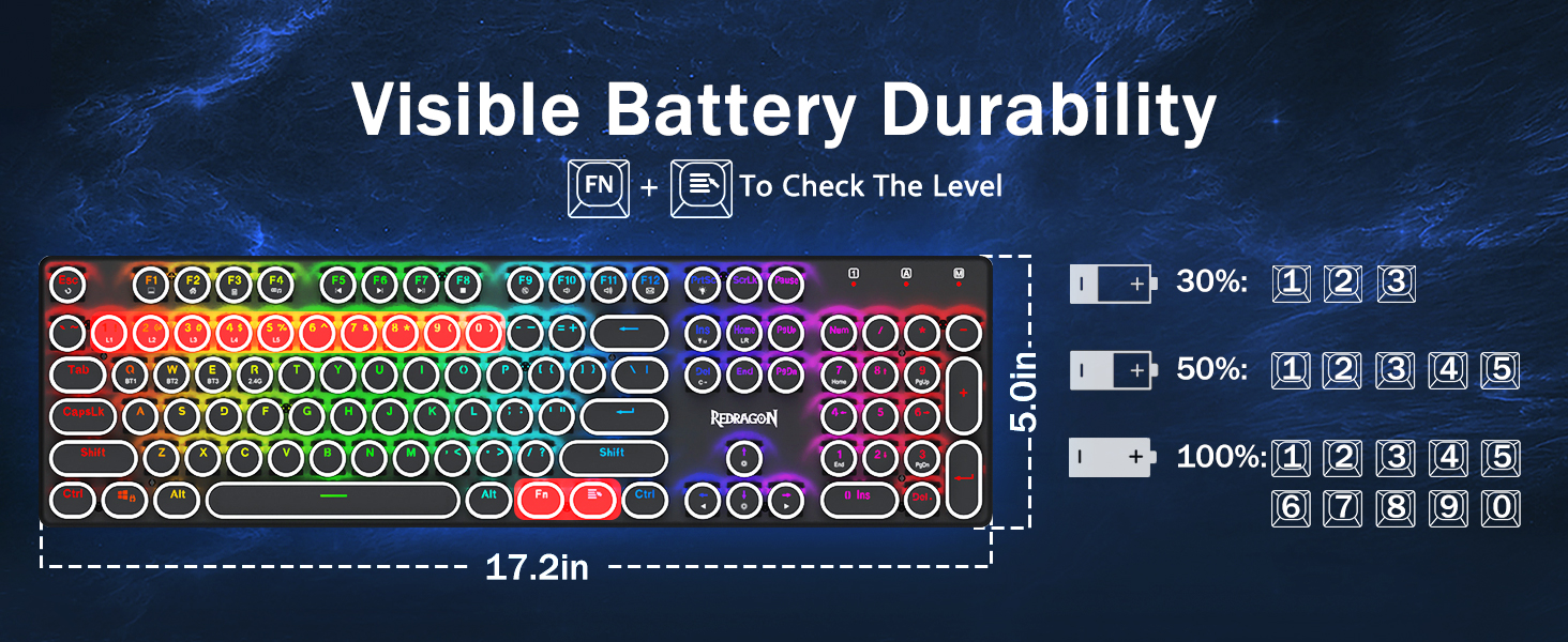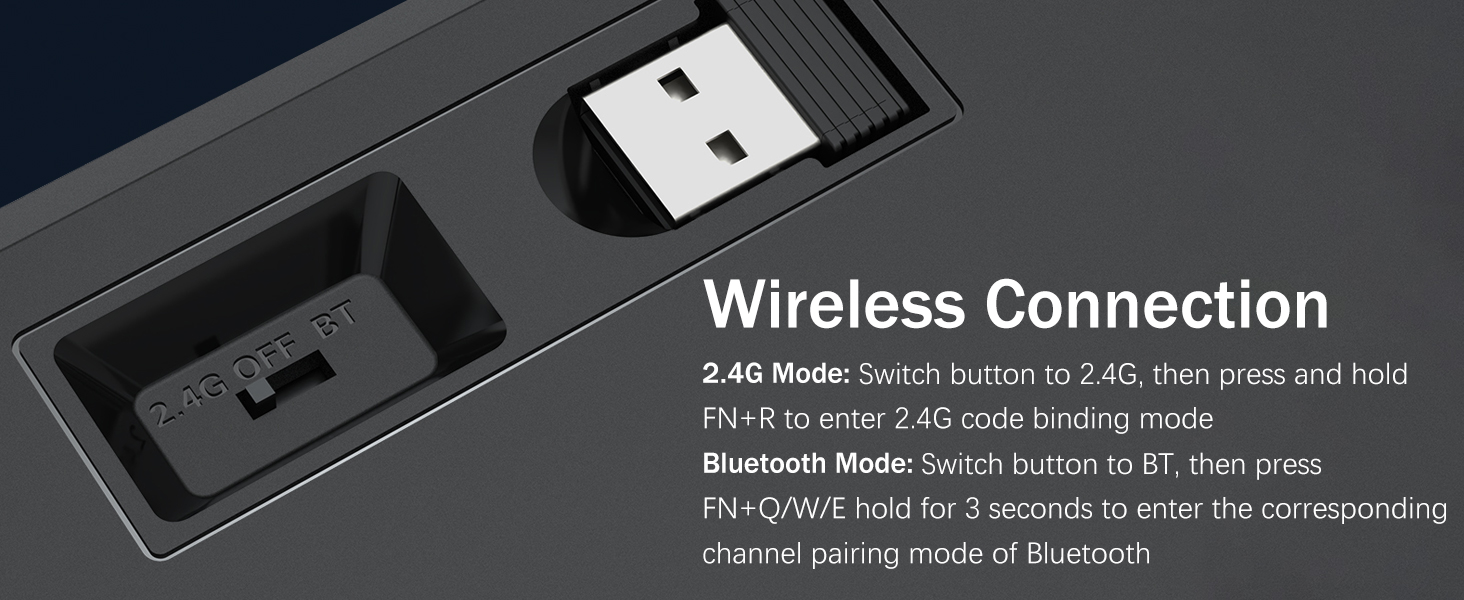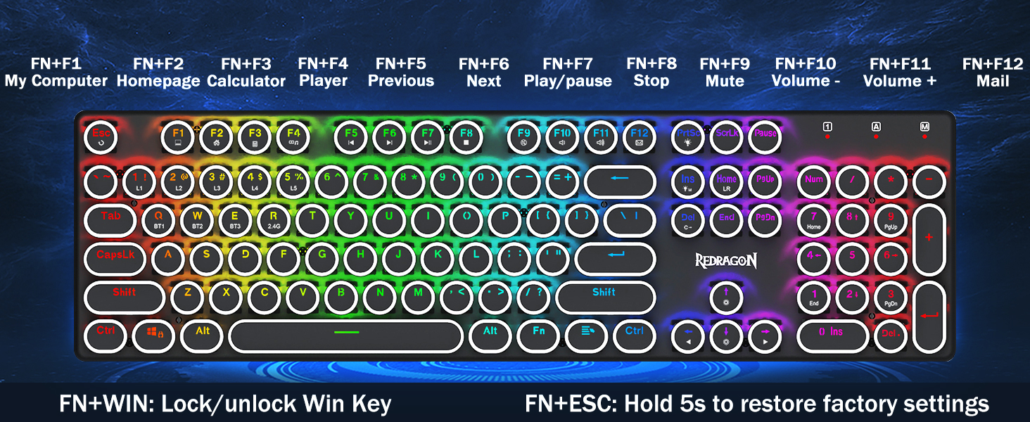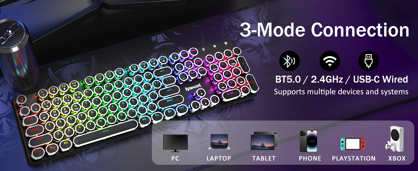 𝟯-𝗠𝗼𝗱𝗲 𝗖𝗼𝗻𝗻𝗲𝗰𝘁𝗶𝗼𝗻 -Taaga ma Redragon FridVevve Tri-Mode Network Technote, USB-C Carehoth 5.0 / 3.0 & 3.4 & 2.4GHZ Fetaomi FN + Q / W / E I Bluetooth Mode, Press FN + R i le 2.4G mode.