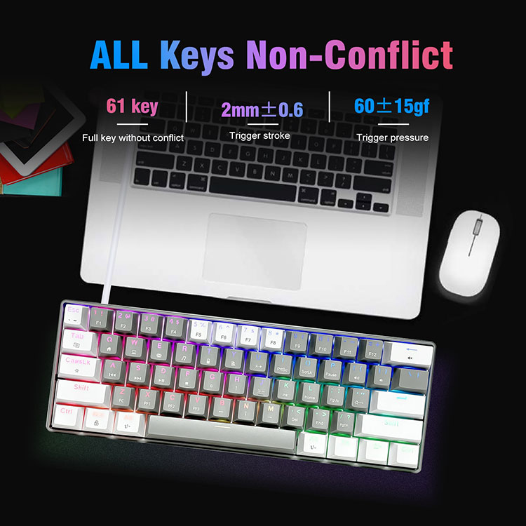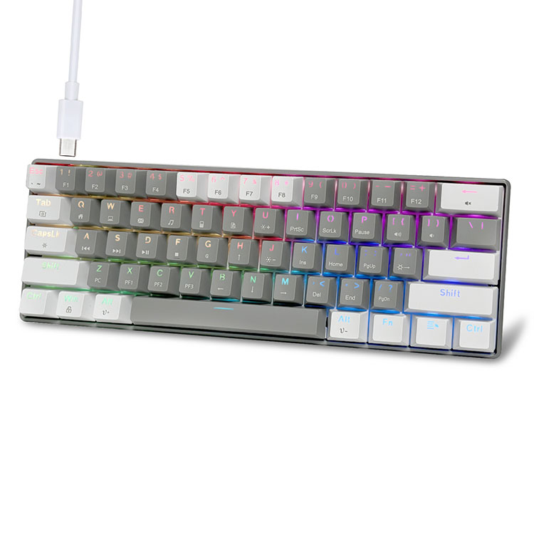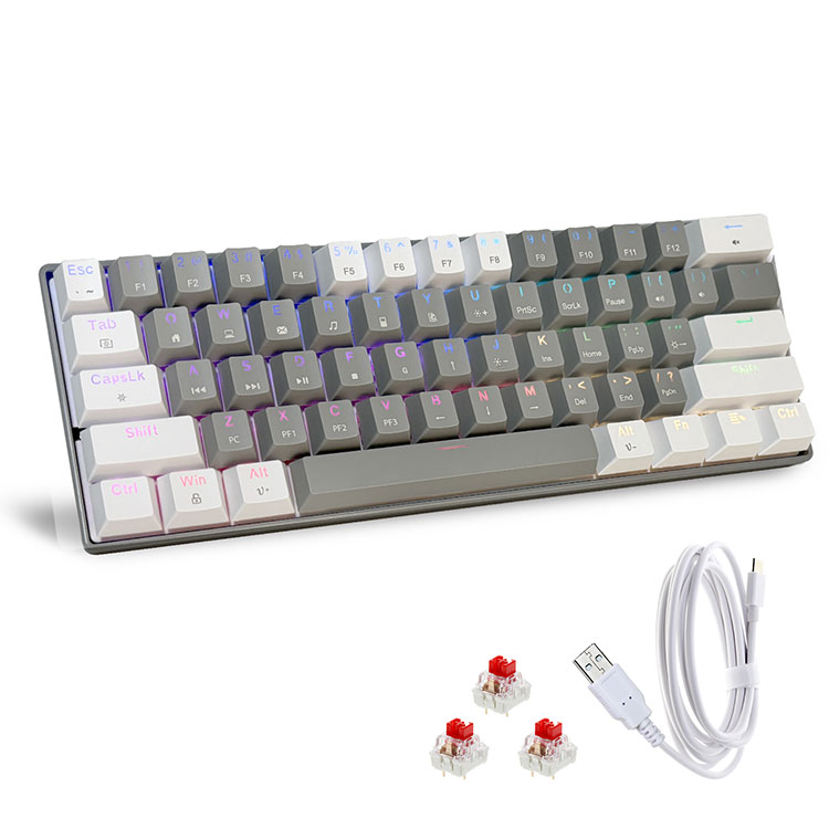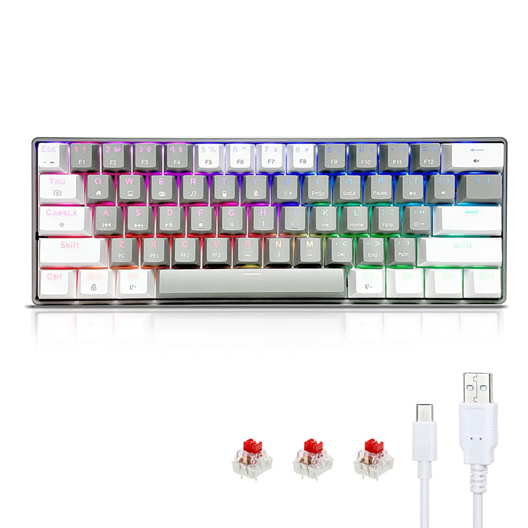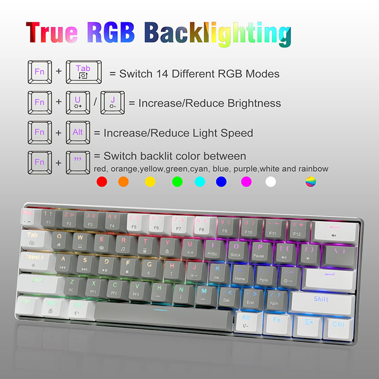· Malamalama RGB i tuaaafiaga O le 60% RGB keyboard e aofia ai le 14 backlight effect ma le 8 solid backlight color switching. Eseese RGB seti e faʻatamaoaigaina ai lou taimi taina. O le saoasaoa o le moli ma le maualuga e mafai foi ona fetuunai e tusa ai ma lou manaʻoga. Fa'alua fana fa'aigoa Keycaps, e le mou atu le amio.