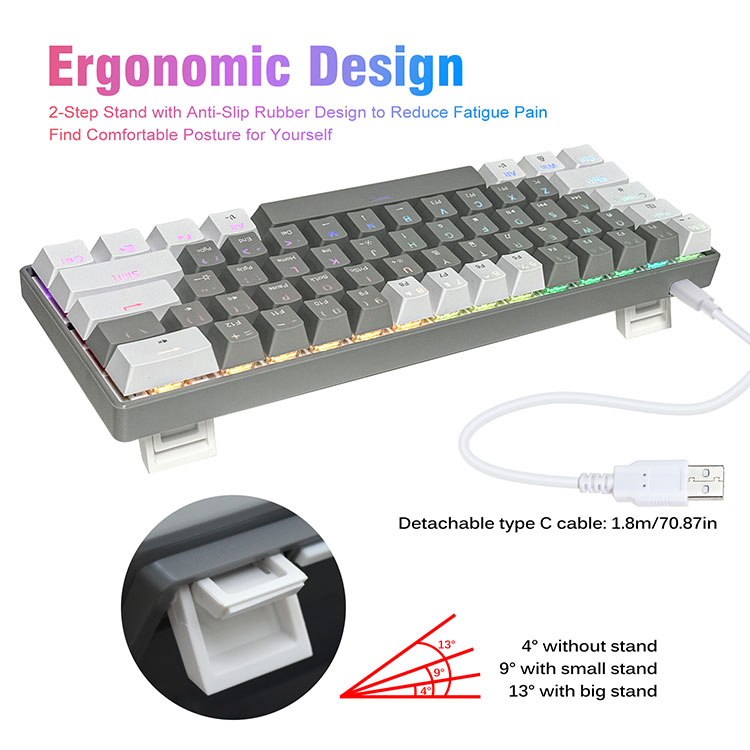 · Atoatoa Anti-ghosting & ErgonomicO ki uma e 61 e leai se fete'ena'i, efuefu pa'epa'e mash up mamanu, ergonomic taofi lua-lanu tui keycap, kickstand vae fa'afe'ese'ese tulimanu ta'i ma ta'e usb uaea, aoga ma matagofie.